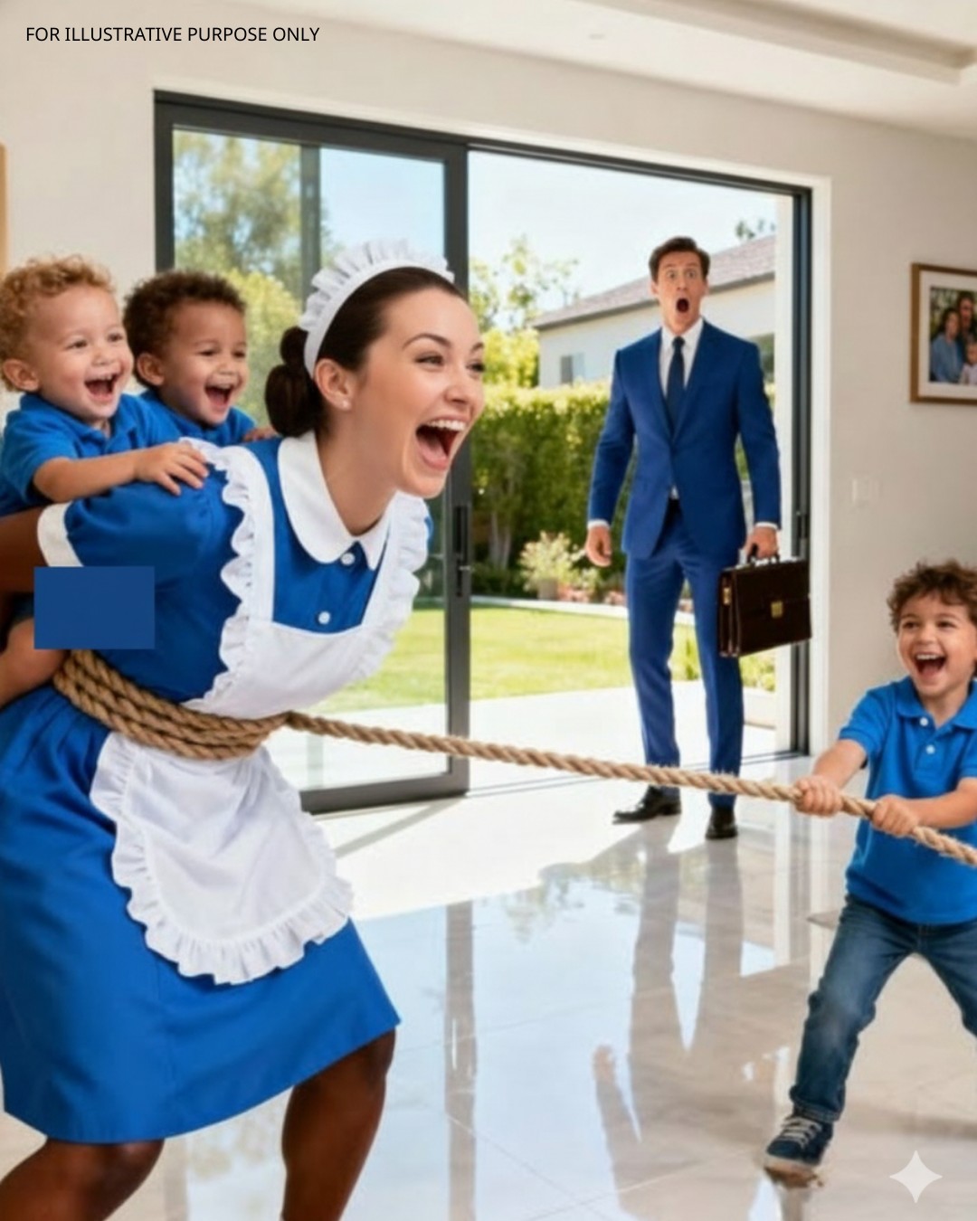 Op het tapijt in het midden van de kamer zat een jonge vrouw op handen en knieën. Drie kleine jongens klampten zich aan haar rug vast, hun wangen rood, hun gezichten verlicht van pure vreugde.