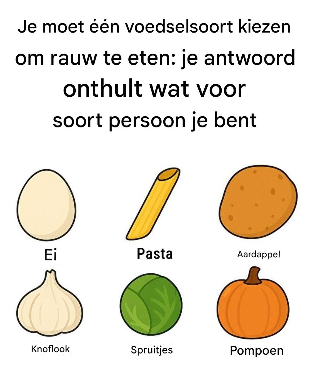 Soms onthullen de eenvoudigste vragen de meest verrassende waarheden. Stel je voor dat je een van deze voedingsmiddelen rauw moet eten: ei, pasta, aardappel, knoflook, spruit of pompoen.