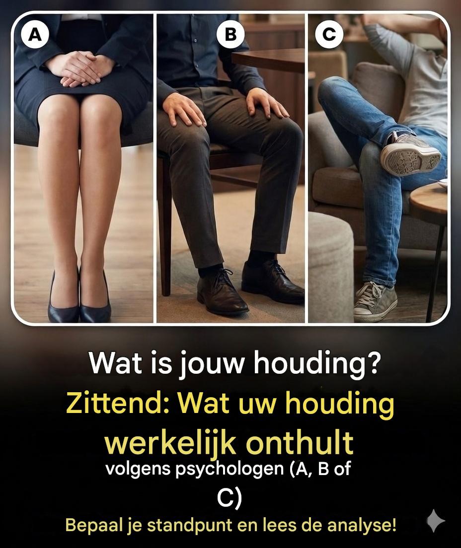 Benen bij elkaar, handen op je knieën Deze klassieke houding (vaak aangenomen door vrouwen in formele omgevingen) roept terughoudendheid, beleefdheid en een sterk gevoel van zelfbeheersing op. Volgens lichaamstaalspecialisten geeft het vaak een signaal van een voorzichtige, geïnformeerde en introverte persoonlijkheid of een verlegen houding in nieuwe situaties. Je beschermt je persoonlijke ruimte, je vermijdt te veel ruimte in te nemen en je kijkt liever voordat je handelt. Het is ook een houding die fatsoen en respect toont voor sociale normen, maar soms een lichte mate van zelfvertrouwen of de wens om zich terug te trekken.