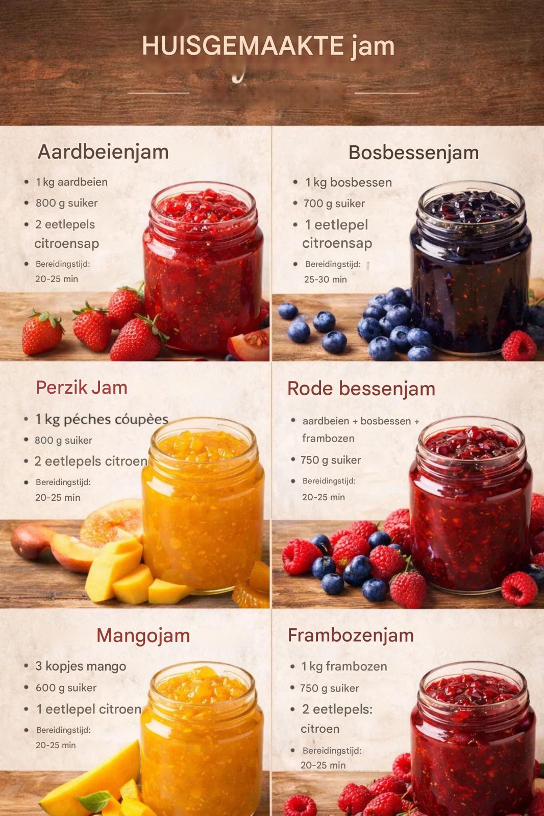 Zelfgemaakte jam is een heerlijke manier om het hele jaar door van fruit te genieten. Ze zijn gemakkelijk te bereiden en vangen de frisheid en zoetheid van seizoensfruit vast. Deze zes recepten — aardbei, bosbes, perzik, rood fruit, mango en framboos — bieden een verscheidenheid aan smaken, perfect voor toast, gebak of yoghurt.